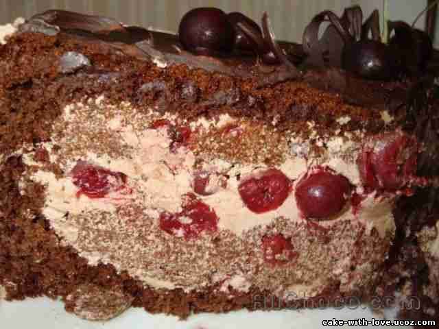 Шоколадный тортик с вишней в ликёре и сливочным кремом.
